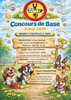 Dimanche 3 maiCONCOURS DE BASEsur le terrain de la Société Canine GenèveLe concours de base permet de s’initier au sport canindans un délai prévisible et est considéré comme une étape préalable à la pratique des sports canins officiels.Plusieurs entraînements sont proposés avant le concours.