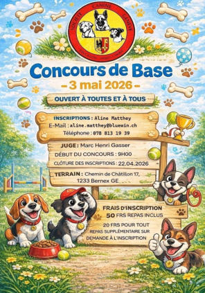AGENDA 2026 Evènements, Rallyes, FêtesSamedi 25 avril, toute la journéesur la Plaine de PlainpalaisJOURNEE D’INFORMATIONSET DE CONSEILS AUXPROPRIETAIRES DE CHIENSOrg. AICCvoir www.infosconseilschiens.chDimanche 3 maiCONCOURS DE BASELe Concours de base permet de s’initier au sport canin dans un délai prévisible et est considéré comme une étape préalable à la pratique des sports canins officiels.Plusieurs entraînements proposés avant le concoursSamedi 13 juinMOBILITY-DISCOOrg. PascaleL’affiche suivraDimanche 21 juinCONCOURS SPORTPLAISIRL’affiche suivra29 juin au 3 juilletSTAGE JUNIORSpour les jeunes de 8 à 18 ansvoir détailsDimanche 20 septembreUPGRADE SPORTPLAISIRLes informations suivront2 à 4 octobre de 12h00 à 13h30ANIMATION DU RING D’HONNEURde l’Expo Canine à Palexpo Genèveà confirmer